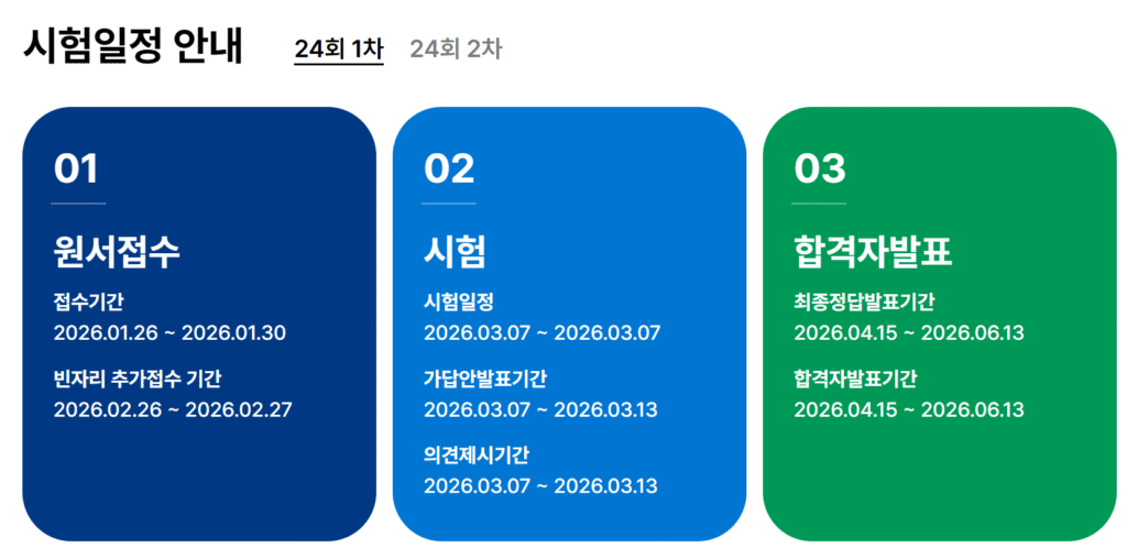 - 제1차 시험일: 3월 7일(토), 합격자 발표: 4월 15일(수) 09:00